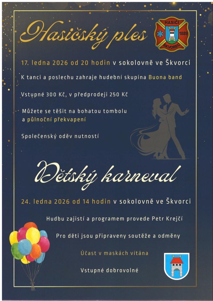 K tanci a poslechu hraje hudební skupina Buona band, bohatá tombola, půlnoční překvapení.... Dětský karneval, sobota 24.1.2026 od 14 hodin. Pro děti jsou připraveny soutěže a odměny.