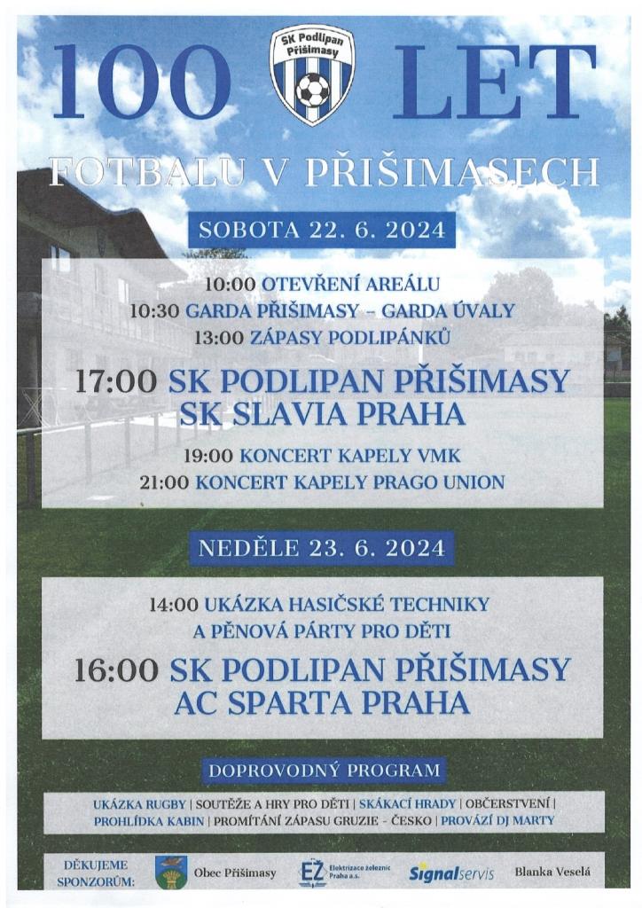 Zveme vás na oslavy 100 let fotbalu v Přišimasech. Připraven je bohatý program po oba dny, včetně skákacích hradů a soutěží pro děti.